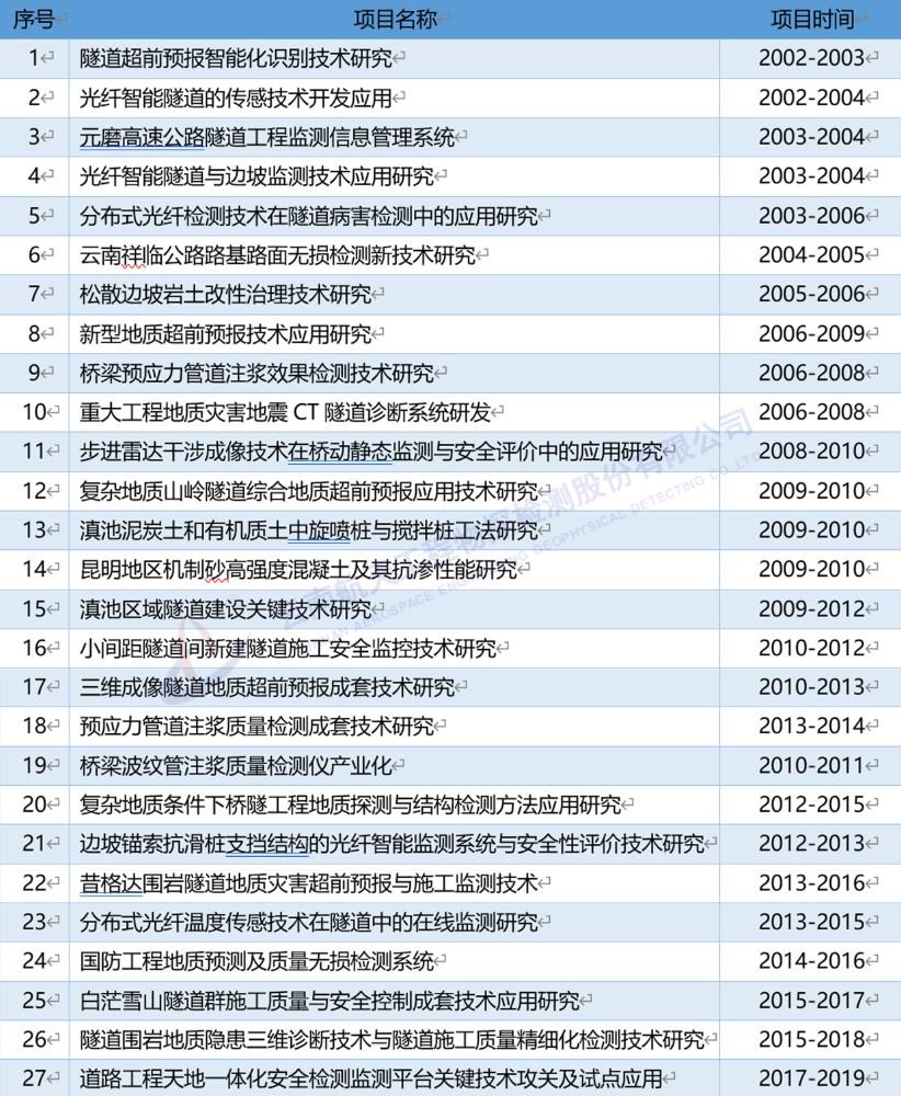 公司源于航天軍工,注重研發(fā)創(chuàng)新,目前建有云南省許厚澤院士工作站、昆明工程物探與檢測領(lǐng)域院士工作站、云南省橋隧工程質(zhì)量控制和評(píng)價(jià)實(shí)驗(yàn)室等九個(gè)科研平臺(tái)。