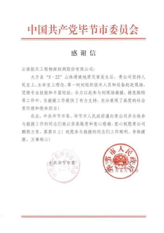 近期,航天檢測收到了來自中共畢節市委、畢節市人民政府的感謝信,信中表達了對航天檢測在大方縣“5·22”山體滑坡地質災害救援行動中積極響應的感謝,以及對在救援行動中所開展探測工作的認可。2025年5月22日,貴州省大方縣果瓦鄉慶陽村突發滑坡地質災害,十余人被困。公司于當日上午接到應急管理部緊急救援指令后迅即響應,第一時間組織擁有豐富應急救援經驗的專業...